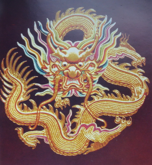 粤绣是广绣和潮绣的总称,一般将广州、顺德、番禺、南海等地的绣统称广绣,潮州地区的绣称潮绣,这个潮州乃是民系概念上的潮州而不限于当今的潮州市一地。粤绣在唐代已有较高技术水平。清《广东新语》记载,粤绣以孔雀羽扭捻为线,绣制服饰等,金翠夺目,还有用马尾缠丝,作绣品的勒丝,订制在纹饰的轮廓边缘,增强了粤绣的艺术表现力。在四大名绣中,粤绣最重装饰性,粤绣的色彩艳丽夺目,构图繁华热烈,风格富丽辉煌,洋溢着南国明快浓烈的特色,题材广泛,其中百鸟朝凤、博古、龙凤传统特色的题材为多(图1-4-5-32 粤绣《百鸟朝凤》·清华大学美术学院藏,图1-4-5-33 粤绣《博古图》·私人藏)。粤绣因“广绣”和“潮绣”两个流派而呈现各自特色。粤绣在绣法上善留水路(在纹样交接与重叠处空出一线底),设色绚烂鲜亮、红绿映衬(图1-4-5-34 广绣《红棉鹦鹉》),而潮绣喜用垫高浮雕绣,寓意吉祥、气氛热烈,金碧辉煌、灿烂壮观,有浓郁的地方风格(图1-4-5-35 潮绣《金龙》)。