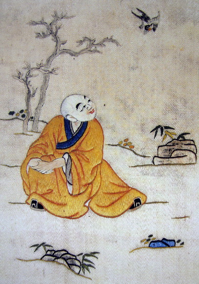 粤绣的历史可追溯至唐代以前,唐代广东海南卢眉娘就是一位刺绣名家:卢眉娘能在只尺绢上绣法华经七卷,字之大小,不逾粟粒,而点划分明,细于毛发。这可能是我国最早见诸记载的精微绣了(图1-4-5-36 清乾隆 精微绣 6CM×9CM 清宫旧藏)。又载:卢眉娘在宫中绣“仙飞盖”,唐顺宗嘉奖其工,谓之“神姑”,可见唐代广东刺绣技艺的水平已非同一般。还有,唐玄宗时,岭南节度使张九皋进献给杨贵妃精美绣品,而获加官三品,亦见粤绣在唐代宫廷艺术的不俗地位。