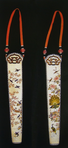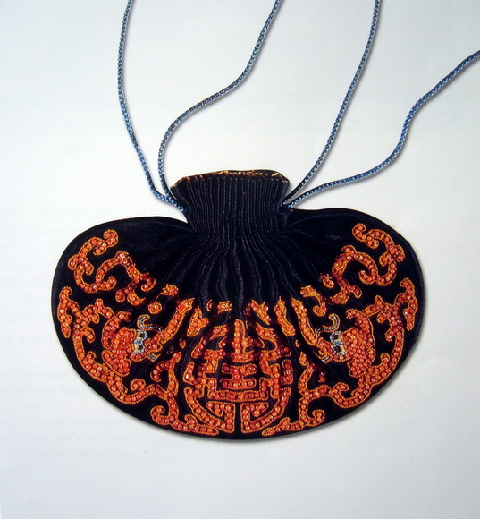 发展到清代,粤绣迎来了全盛期。清代的粤绣艺人多是广州、潮州等地的,绣工皆为男性,乃其他地区所罕见,潮绣中以加高垫金银绣最具特色,且绣花方法丰富,绣材多样(图1-4-5-40 潮绣 龙 北京邵晓琤织绣研究院藏)。由于广东特有的地理位置,清乾隆二十二年(1757年)清高宗诏令西洋商船只限进广州港,自此,对外进出口贸易的便利,促进了粤绣的进一步繁荣。1793年广州成立刺绣行会,刺绣专业艺人达三千多人,接着广州、潮州普设绣行、绣庄、绣坊,粤绣专业队伍不断扩大。18世纪粤绣风靡英国皇家及上流社会,成为他们炫耀财富和身价的时尚,还促动了英、法皇家宫廷刺绣的盛行与发展。光绪年间,广州成立工艺局,设立广绣坊,还在广州开办缤华艺术学校,由岭南画派始祖高剑父任校长(图1-4-5-41 清 粤绣木棉松鹰 私人藏),专门设有刺绣教学项目,致力于刺绣高级人才的培养。至光绪26年,我国刺绣品销往海外的,数广东为最。宣统二年(公元1910年),潮州林新泉等二十四位绣花技师全力合作,绣的大幅粤绣《苏武牧羊》、《丹凤朝阳》等在南京的南洋劝业展会上获奖,潮州二十四位绣花状元立即传为佳话(图1-4-5-42 清 粤绣 清宫旧藏)。此外,粤绣还擅大量运用珠子绣作,清代广州状元坊就有云额、拖鞋等珠绣绣品出售,而绣的粤剧戏服珠光闪烁,富贵华丽,至今仍有珠绣的各式手袋和拖鞋畅销海内外(图1-4-5-43 清 缉珍珠、珊瑚绣香囊 中国嘉德2005春季拍卖品 1.32万成交,图1-4-5-44 清 粤绣 扇套,私人收藏)。