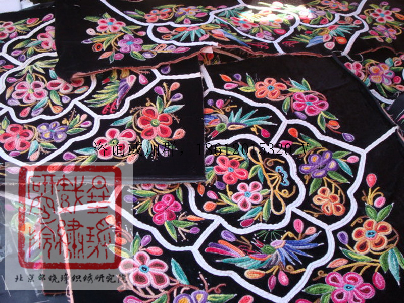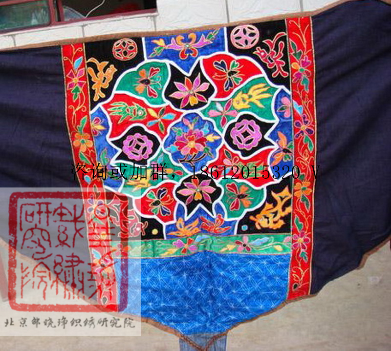 壮族背带绣,流行于广西天峨、龙州等地区,绣被带是背小孩用的。它由许多独立的花纹小块组成,在每条丁字形背带上配以三角形、扇形、菱形等图案,多取龙、凤、牡丹等种种传统纹样,然后将裁剪成形的图案根据需要贴在各种色布或绸缎上,用多种深浅不一的绒线刺绣,最后镶接成完整的背带绣片。(图113)