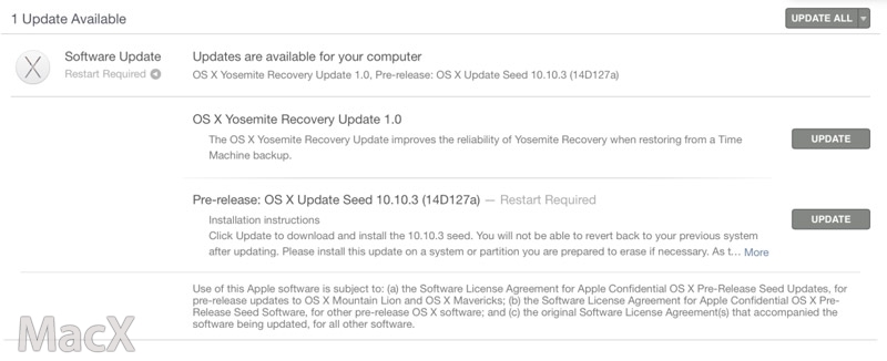 苹果今天向开发者和公开 Beta 测试项目成员, 发布了 OS X 10.10.3 Beta 6, 版本号 14D127a. 现在 10.10.3 的 Beta 测试已经过去了两个月. 用户可以通过系统更新, 或到苹果官网开发者中心下载. 同时苹果还发布了 Yosemite Recovery Update 1.0, 增强了从 Time Machine 备份恢复时候, Recovery 功能的稳定性.