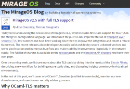 MirageOS 2.5 发布,此版本首次在 MirageOS 配置语言支持 SSL/TLS,引入了 TLS 的纯 OCaml 实现。此版本同时包括大量的 bug 修复和稳定性改进(主要是网络)。更多改进详情请看发行说明和重要 API 改进。