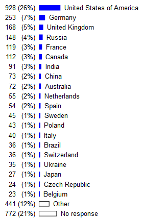 大部分人主要通过 Stack Overflow 寻找 Go 相关问题的答案,其次是官网 golang.org;绝大部分被调查者来自美国,之后是德国、英国、俄罗斯、法国、加拿大、印度和中国,这与访问 golang.org 的地理数据基本一致但有差异,印度、中国和日本各自占了大约 5% 的访问量,但被调查者的国别比例分别只有 3%, 2% 和 1%。