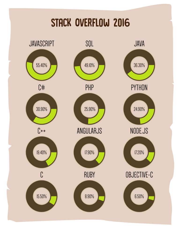 Stack Overflow 是一个问答平台。它有超过400万的用户,问答了1000多万个问题。根据问题情况,Javascript 的使用者比其他语言的都要多。另外,与 Node 和 Angular 相比,PHP 排名有所下滑。