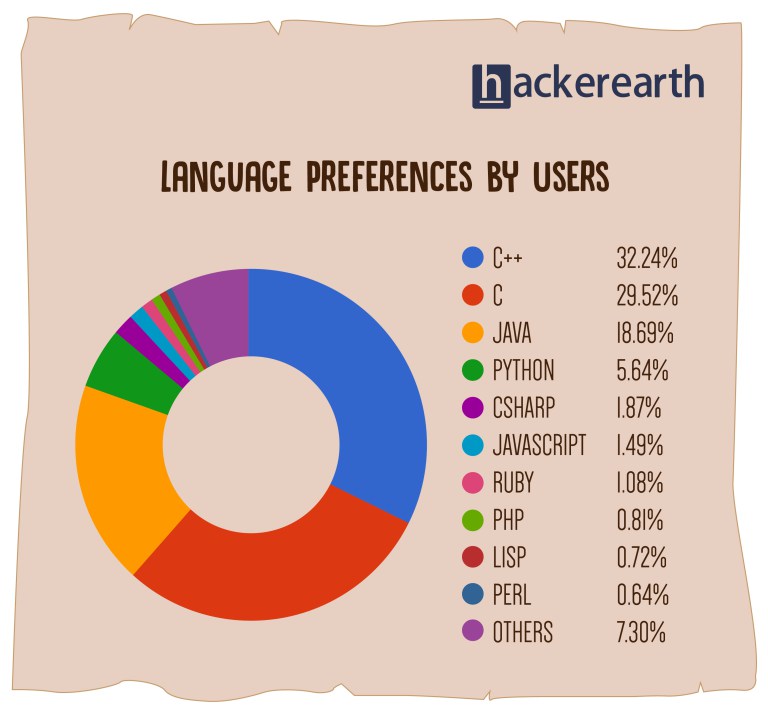 HackerEarth 每月都会为用户提供大量的编码挑战和应聘机会。该公司支持30多种编程语言,用户可随心选择。HackerEarth 内有100多万名程序员,来看看他们最喜欢使用的是什么: