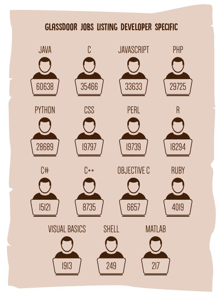 这个网站的成立使员工可以对组织进行评价。Glassdoor 列出了开发者的工作事项。如果按开发人员的类别排名,该公司最需要的是 Java 开发人员,其次是 Javascript。当然,R 和 C++ 也比较受欢迎,Python 和 Perl 的需求也有了上升。