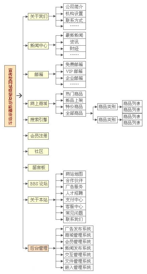 宣传型网站设计、开发具有相当的灵活性,其功能可以根据企业的具体需求进行调整,一般而言,宣传型网站建设解决方案的功能模块的设计如下: