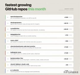 🚀 2026年3月GitHub增长最快开源仓库榜单出炉! 公司动态 App方案 编程语言 Top 10 全是AI智能体/工具向项目,OpenClaw 狂揽122K星断层第一🔥1️⃣ openclaw/openclaw:个人AI助手,全系统24/7运行 (+122K)2️⃣ obra/superpowers:AI Agent即插即用工具框架 (+30.7K)3️⃣ ruvnet/RuView:无... 2026年3月16日