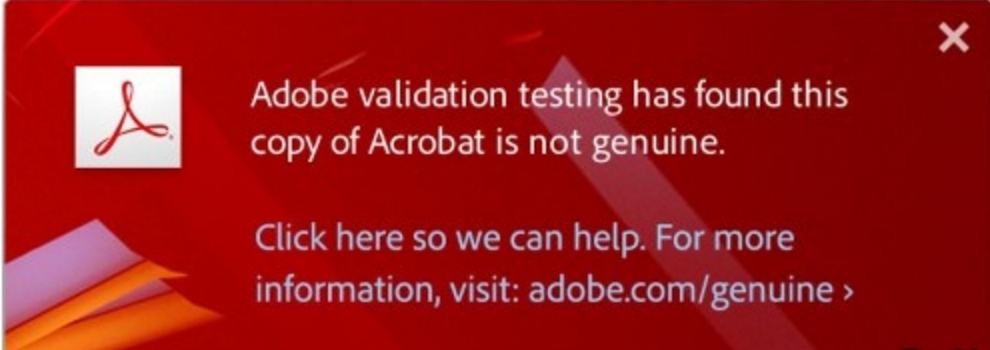 即便是被检测为盗版软件,用户不会受到Adobe的任何惩罚,只是会被简单地弹出一个小窗口,上边写着:“Adobe验证测试发现Acrobat的这个副本不是正版。点击这里让我们帮助你。欲了解更多信息请访问adobe.com/genuine。”