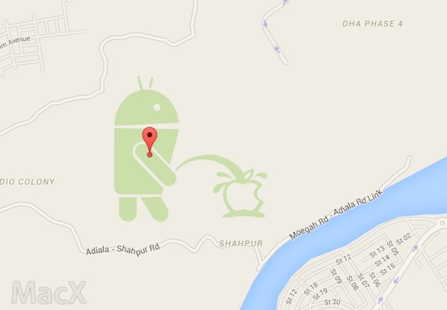 Team Android 今天发现了谷歌地图中的菜单,访问巴基斯坦 Rawalpindi 外围时,可以看到谷歌 Android 吉祥物,绿色小机器人向苹果 logo 小便的图片。目前还不清楚是谁创造的这幅图片,并嵌入谷歌地图中。如果谷歌知道图片的存在,那将是非常有趣的事情。苹果和谷歌两家公司已经成为竞争对手, 比如苹果地图和谷歌地图之争,以及著名的 iPhone 和 Android 智能手机究竟谁更优秀这一经典的话题。