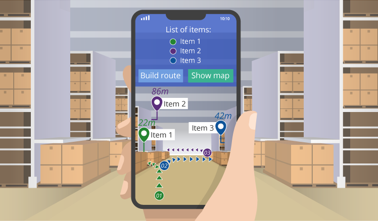 如果您选择在AR应用程序的功能包中进行导航,则此功能是下一步的合理选择。员工到达必要的位置后,应用程序会通过指向它自动找到该项目。但是,如果您的仓库小于25,000平方英尺,并且不需要导航说明,则此功能也可以是拣配过程中的第一步。但是,在这种情况下,该功能必须从先前引入的可能性开始,以从内部系统加载项目列表。