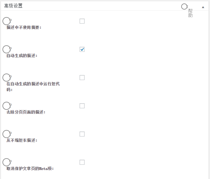 找到高级设置,有一个自动生成描述,这个功能非常给力。我们在写post的时候,描述可以自动从文章中截取,非常方便。