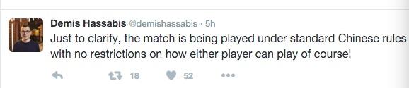 就在不久前,DeepMind公司的首席执行官,同时也是AlphaGo项目的领导人Demis Hassabis通过个人推特对此事进行了回应:“我要说一下,这次比赛是严格按照中国规则进行的,当然不会有限制棋手下棋方式的协议。”