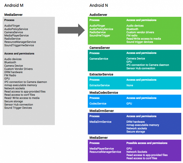 在Android N中,Google将媒体服务拆分成了不同的片块,每个都只能访问一个特定的子系统。