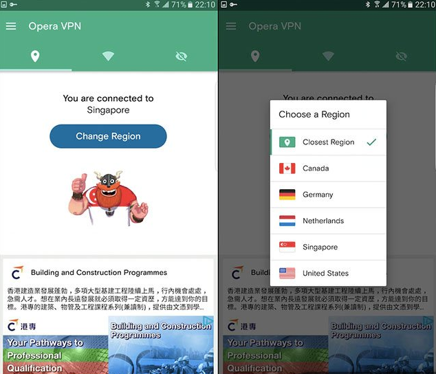 Opera VPN服务主要是由Opera的子公司SurfEasy来提供,今年5月在全球推出iOS版本后,已有超过百万下载量,目前亦支持Andorid装置,可让用户选择使用美国、加拿大、德国、新加坡、以及荷兰等5个服务器位置。Opera VPN另外还提供Wi-Fi测试工具,可针对Wi-Fi网络进行侦测扫描,检查用户所联机的Wi-Fi网络类型是否经过加密保护,以及有多少装置使用同一个联机,如果测试工具侦测到任何联机的弱点,它将通知用户启动VPN。