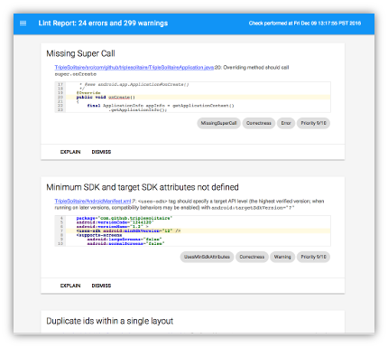 5、Lint:命令行 HTML reports 已经被大修 – 不再是旧的暗色 Holo 外观,现在有一个 Material 设计外观,并且包括代码片段语法突出显示等等。