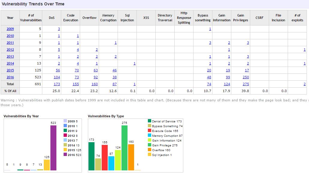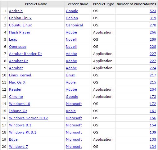 CVE Details 提供的统计数据显示,Android,Debian Linux 和 Ubuntu Linux 是 2016 年最易受攻击的三种产品。