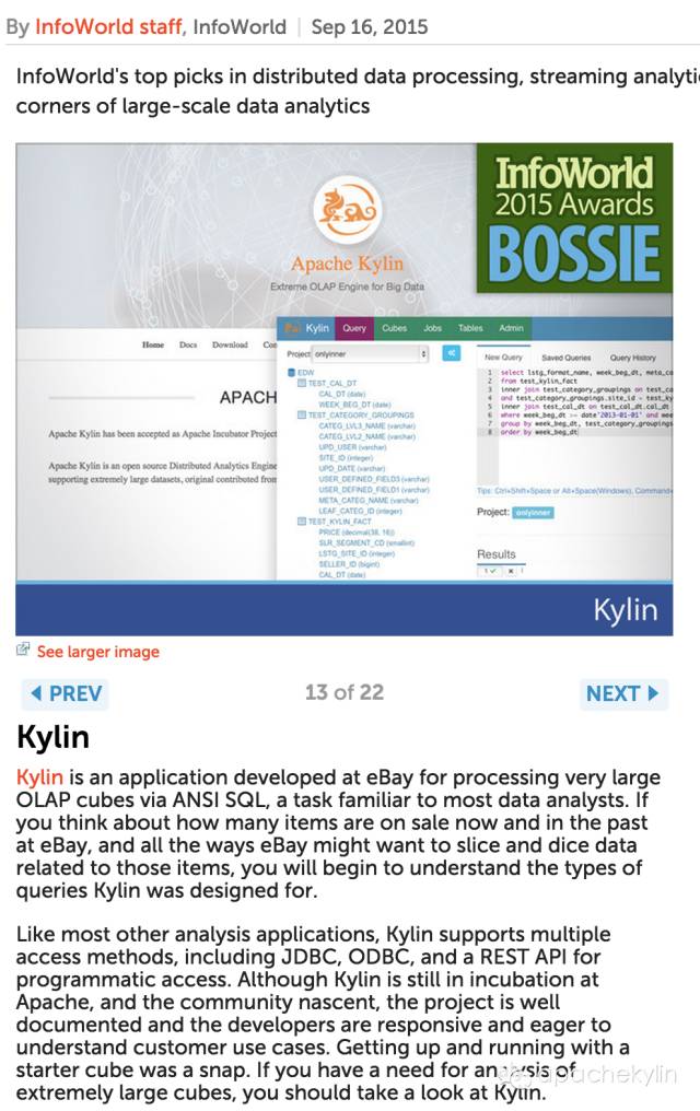 在刚刚公布的 InfoWorld Bossie Awards 2015 中,Apache Kylin 与其他众多项目,包括 Spark,Kafka, H2O, Elasticsearch,Zeppelin 等,一起入选“最佳开源大数据工具”奖,是国内团队唯一的一次上榜。 这是 InfoWorld 独立调研和评选的奖项 2015年10月13日业界资讯 淘江湖分享到淘江湖开心网分享到开心网豆瓣分享到豆瓣人人网分享到人人网腾讯微博分享到腾讯微博新浪微博分享到新浪微博QQ空间分享到QQ空间微信分享到微信 The7.2 v2.3.5深度汉化企业项目用途版本更新说明戴尔就收购 EMC 交易发布公开信 相关文章马来西亚台球厅管理系统,台球室系统源码,台球厅 app2025年12月24日杭州APP开发公司哪家好?(2025)不踩坑的选型方法 + 真实对比清单2025年12月22日源码交付,打造东南亚“国民级”社交应用:仿微信IM系统高并发架构与出海方案2025年12月22日2026 年最新国内 wordpress 网站优化插件,2025年12月13日但是我要用 bbr3,那服务器系统哪个好?2025年12月12日服务器的操作系统,为什么你都不推荐Ubuntu 24?2025年12月12日