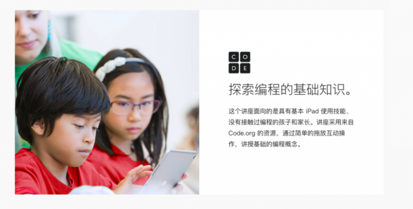 这个讲座面向的是具有基本 iPad 使用技能、没有接触过编程的孩子和家长。讲座采用来自 Code.org 的资源,通过简单的拖放互动操作,讲授基础的编程概念。