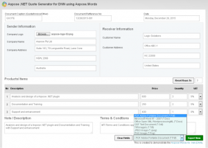 Aspose .NET Quote Generator for DNN 是 Aspose 的开源模型,可以让用户在无需其它软件的辅助条件下,在你的 DNN 网站生成 Quotations。它使用 Aspose.Words for .NET 的强大特性,让你轻松生成 quotation。第一个版本特性如下: