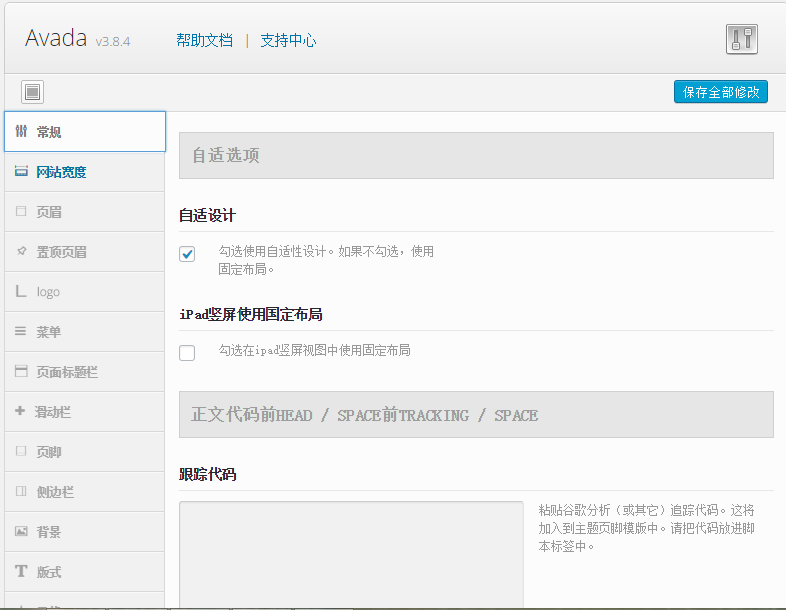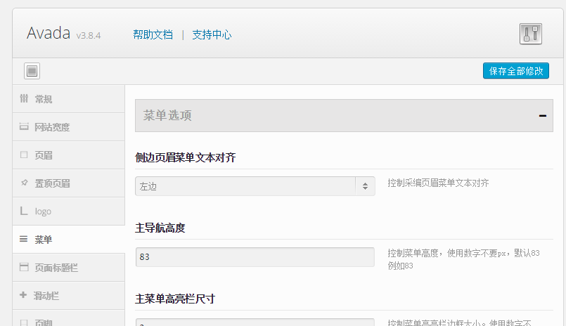 (基于官方原版优化和汉化,Avada v3.8.4深度汉化文章非常详细的介绍)可以看到非常详细的中文使用菜单。
