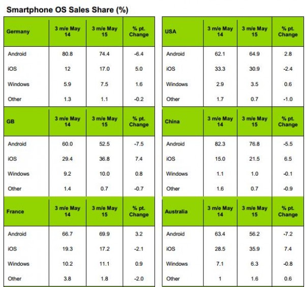 然而,与去年同季相比,Windows Phone在美国市场的表现不太亮眼。到2015年五月结束,Windows Phone在美国市场份额是3.5%,仅比去年同期增长0.6%。即使是在其他主要的市场,如中国,日本和澳大利亚,Windows Phone无法在市场份额上产生显著的影响。Windows Phone唯一表现良好的地区是欧洲,包括英国,意大利,德国,西班牙和法国,Windows Phone操作系统市场份额上升到9.5%,比去年同期增长1.5%。