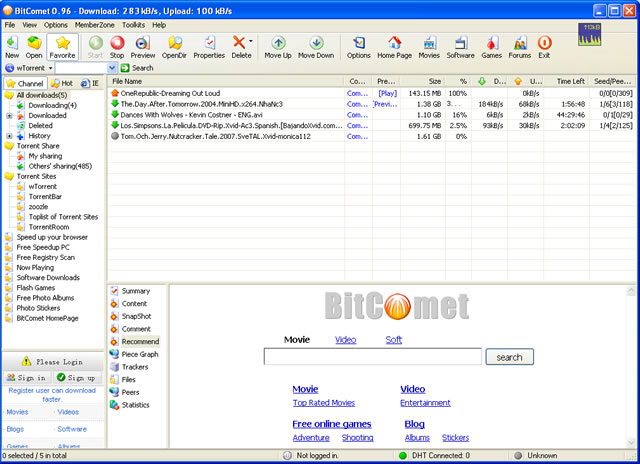BitComet(比特彗星)是一个完全免费的BitTorrent(BT)下载管理软件,也称BT下载客户端,同时也是一个集BT/HTTP /FTP为 一体的下载管理器。BitComet(比特彗星)拥有多项领先的BT下载技术,有边下载边播放的独有技术,也有方便自然的使用界面。最新版又将BT技术应 用到了普通的HTTP/FTP下载,可以通过BT技术加速您的普通下载。