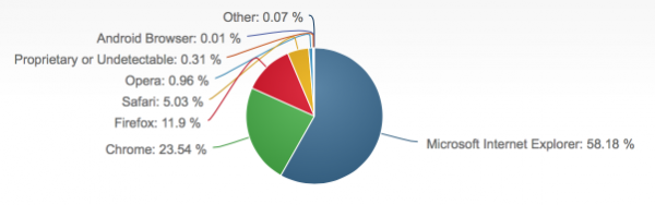 来自 Net Market Share 的数据,1月份,占据全球浏览器排行榜首位的仍然是IE浏览器,总市场份额高达58.18%,但较上个月的59.11%还是出现了小幅下降。Chrome浏 览器位居第二位,最新市场份额23.54%,2014年12月份同期数据则为22.65%,增长近1个百分点。Firefox火狐浏览器以11.9%的市 场份额位居第三位,而12月份的市场份额为11.91%,变化不大。