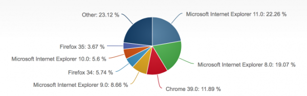 具体到浏览器版本,IE11浏览器以22.26%的份额位居第一位(12月份21.79%),IE8以19.07%的份额排名第二(12月份为19.28%)。Chrome 39 版本以11.89%的市场份额位居第三位。IE9则以8.66%的份额排名第四(12月份为9.29%)。