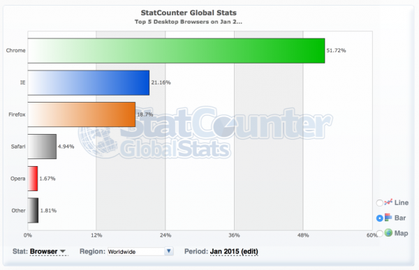 另一份来自 StatCounter 的统计数据则显示: Chrome 浏览器名列第一,市场份额51.72%,而上个月同期数据为49.66%,上涨明显。 IE浏览器位居第二位,市场份额21.16%,12月份同期数据为24.55%,跌幅超近3个百分点。火狐浏览器在2015的1月份中占据18.7%市场 份额,较上月份额的18.01%出现小幅下降。Safari浏览器市场份额为4.94%,而12月份份额则为4.7%,上涨0.24%。第五位的 Opera 市场份额为1.67%,上月数据为1.5%。