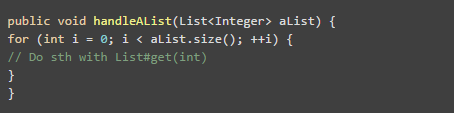 假如外面传入的 aList 是一个 ArrayList ,那么 List.get(int) 的时间复杂度是O(1),算上外面那重循环则是O(n);而假如 aList 是一个 LinkedList ,那么 List.get(int) 的时间复杂度是O(n),算上外面那重循环则是O(n2)!
