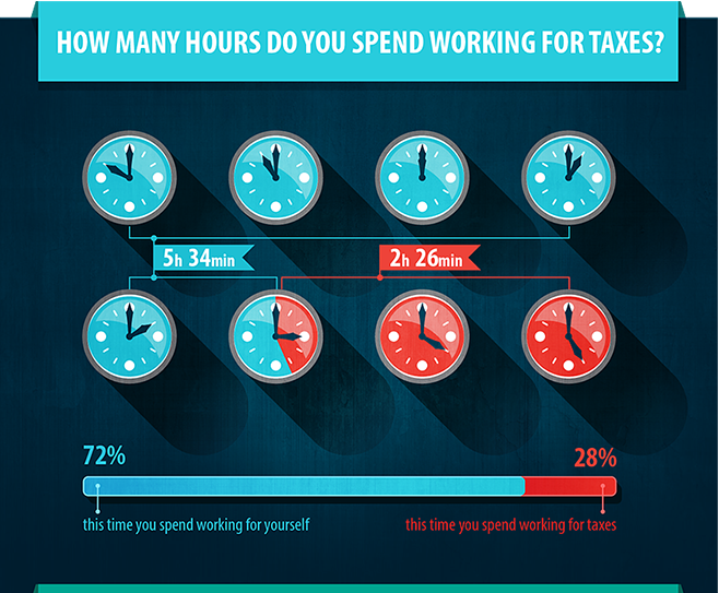 根据最新的“福布斯”调查,8个工作小时中,一个人花了2小时26分钟缴纳各种税费:联邦,州和地方。