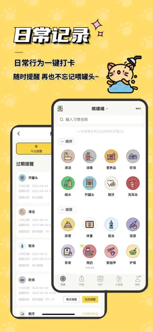 记录日常宠物吃饭、喝水、驱虫、疫苗、体重,还可自定义日常行为,直观查看日常行为月度统计、年度统计,行为可按天、按周、按月进行打卡!