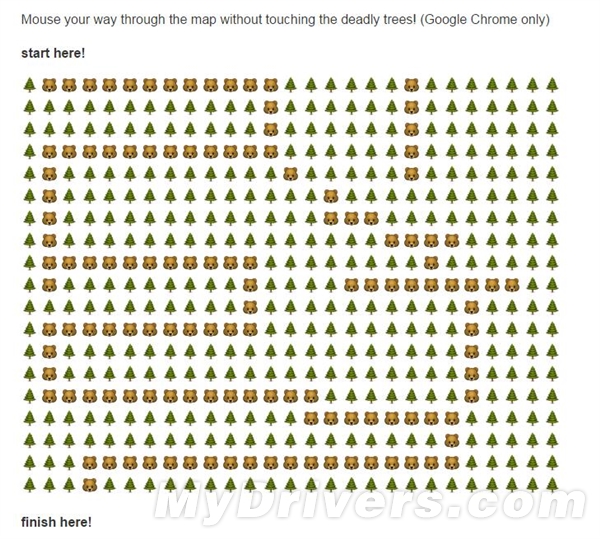 玩法很简单:用你的鼠标,沿着熊的表情符号一路往下走,别碰到树,否则就会触发Bug,立即Game Over,页面崩溃。