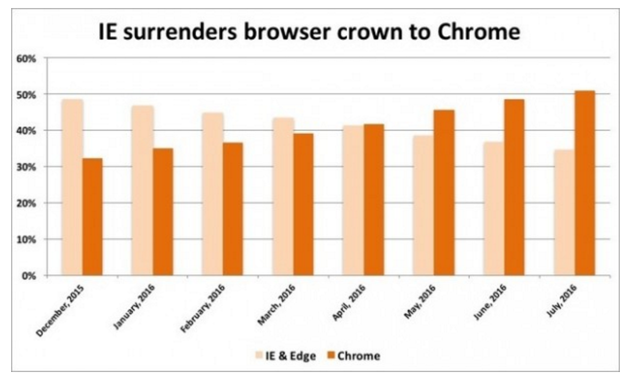 自今年初以来,Chrome市场份额累计增长18.6个百分点。Chrome市场份额的增长基本上就是微软送出的“大礼包”,它1月份要求IE用户升级到最新版本,并不再支持IE 8和IE 10。微软的这一政策要求大多数用户升级到IE 11。面对微软的要求,许多用户选择换用其他浏览器,其结果是大量用户抛弃IE换用Chrome。