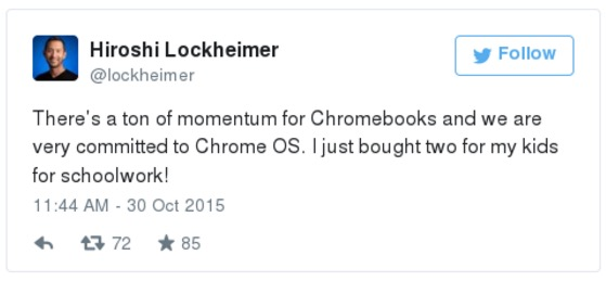 他说:“Chromebook笔记本发展势头凶猛,我们将继续致力于Chrome OS。我才给我的孩子们买了两台用来做作业。”