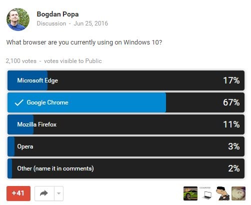 根据微软Google+社区的一项近期调查,用户投票选出了他们在Windows 10平台上最喜欢的浏览器(含PC、笔记本、平板),Google Chrome再次毫无悬念地成为了大家的首选。Google Chrome以67%的成绩高居榜首,其次是Microsoft Edge(17%)和Mozilla Firefox(11%),Opera只占3个百分点,其它浏览器合计2%。