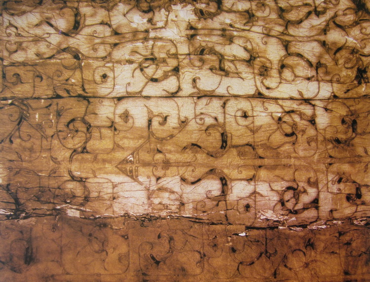 浅黄绢刺绣对凤对龙纹面衾(图1-1-2-5),长220CM,宽207CM,衾里为灰白色绢,多幅拼缝而成,接处纹饰错位排列,由多组对称龙凤纹组合,依然是辫子针绣成,战国风貌显著。