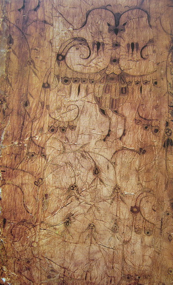 浅黄绢刺绣凤鸟花卉纹锦袍(图1-1-2-8),身长165CM,袖展125CM,此袍为三角形领,右衽,直裾,辫子针绣。主体凤鸟图案,夸张变形,头冠高而华美,羽翅以点线面的组合模拟羽毛形制,以红棕、褐等色线填满翎端,风格华美,是一件战国时期难得的服饰刺绣精品之作。