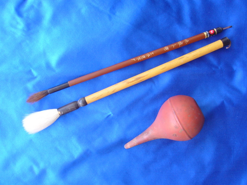 当收购到刺绣藏品后,拿回家后,不要马上就一下清洁处理,准备一支新的羊毫笔,一支新的狼毫笔,一个用于相机镜头保养的气吹,先用羊毫笔在刺绣的表面轻轻地扫一遍,扫过后,用气吹吹几下,吹掉表面的浮尘,然后,再用狼毫笔仔细扫出有可能比浮尘更大,或藏在线缝里的污垢、颗粒,尤其是年久的刺绣很可能会有些肉眼看不到的蛀虫之类的残垢,而后,再用气吹吹一遍,去掉用笔扫出来的浮尘和有可能从毛笔上掉落的笔毛,确保绣面的清洁(图313)。