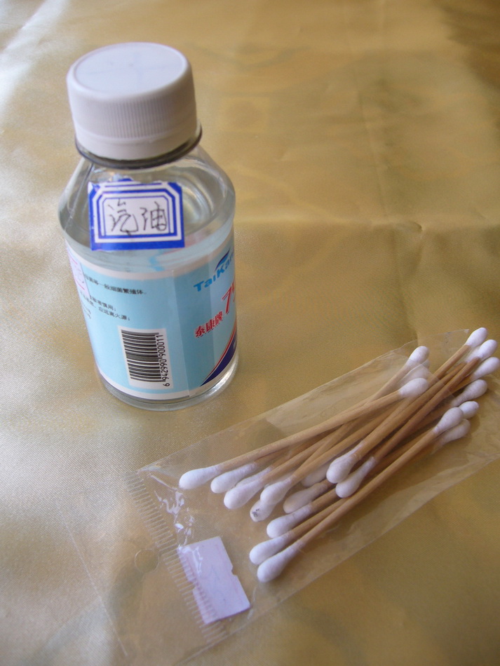 你所购的刺绣品,如发现或不小心染上了油渍,千万不要轻易下水洗涤,也不要考虑用肥皂粉去污渍之类的局部搓洗,最好选择航空汽油,有可能的话选择航空发动机汽油更好。操作时,用棉签蘸少许汽油,在有油渍的地方轻轻擦拭,油渍就会轻松去掉,注意擦拭时的动作一定要轻,不能因急于去垢而用力太过,以免在绣面上擦出无法修复的痕迹。(图314)