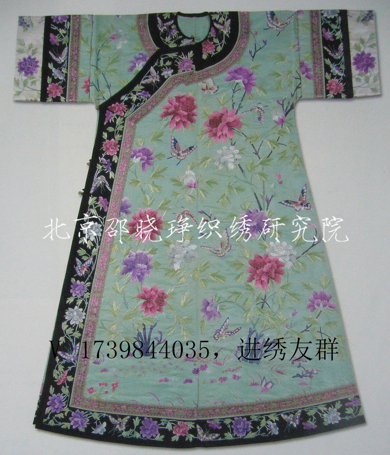 清末后妃衬衣(图157,图158,图159,图160)是清晚期满服中较为流行的刺绣服饰,是宫廷后妃穿着最多的款式,它既可单独穿用,亦可外加马褂、氅衣等,刺绣工艺和图案多精美绝伦。例此衬衣以三绿色缎面做底,上绣洋红、玫红、淡湖蓝三色牡丹花,间绣各色翻飞的蝴蝶,下方绣有灵芝、海棠和小草,洋溢着春天里万物繁华、花荣似锦的祥瑞气息,领、襟、摆、袖均镶有花边和精绣的花沿边,双挽袖镶着白色缎底刺绣袖口,整件服装运用了套针、缠针、戗针、游针、标针、打籽、接针等数种绣法,精致细腻,出边整齐,水路清晰,针工娴熟,绣工讲究,是晚清宫廷服饰刺绣的精品。