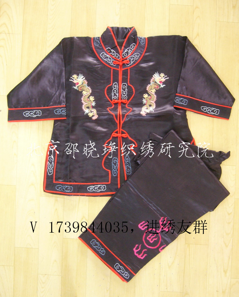 在童装上刺绣,也是人们生活中常见的,刺绣不仅把儿童服装打扮得更加生动活泼,还给无邪的童真世界增加了许多美好和快乐。童装的刺绣图案多以可爱的小动物为首选,也有选择花卉的,更有喜欢绣有中华传统图案风格的,比如在黑色的童装上,胸前左右各绣一条行龙,背后绣一条正龙,衣边、领边、袖边都绣上云纹,在童裤左右的裤腿上绣火球,裤脚边也同上衣边一样绣着云纹,大红的滚条和手工盘扣特别醒目并上下呼应,整套童装在刺绣图案的点缀下,显得精神十足,神气大增,尤其适合小男孩穿着。图166-1,图166-2