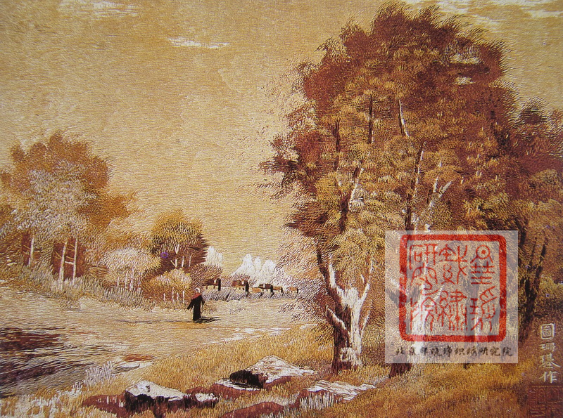 华璂传世作品甚少,但即使有限的绣品,依然可看出她绣艺的过人之处。由于她具有中国传统文化的熏陶,也有西方艺术的接触,因此,她绣的风景绣大都以西洋水粉画、油画为稿本,大胆地打破了刺绣喜用传统国画稿本的习惯,敢于用西画写实的风格,自由放针刺绣,线条灵活多变,用丝也多用合色线,以丰富色彩的明暗,光线的表现力,用丝粗细也匠心独到,粗旷之中带缜密,显得极其洒脱奔放(图2-2-2-22 《风景》,现藏苏州刺绣研究所)。
