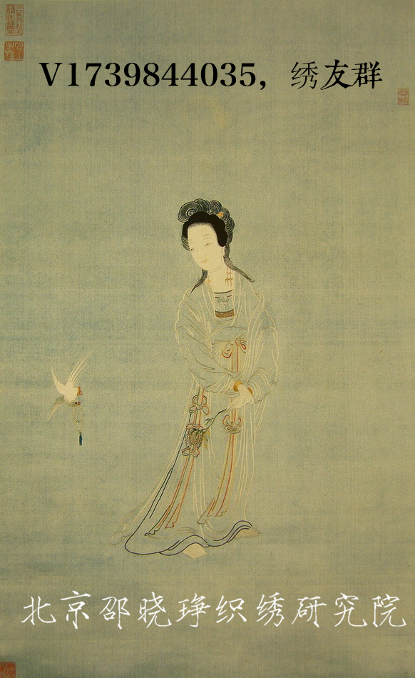 王氏,蒋溥之妻,擅绣。清代乾隆年间,绣有观音大士像二轴,解放前曾存故宫宝蕴楼,又绣罗汉像一册。她的丈夫是清代著名画家蒋廷锡之子蒋溥,雍正八年进士,乾隆年间官至东阁大学士,亦擅画。生活在这样一个人文之家,王氏的刺绣似乎是超逸的,从这幅湖色的缎底绣观音像上见其绣风绣法,纤细雅静,观音手持柳枝,面目祥和,鹦鹉口衔念珠振翅飞翔,大面积的湖蓝底背景,形成一个辽阔的空间,很显超凡脱俗(图2-2-2-12,绣观音像,现藏故宫博物院)。