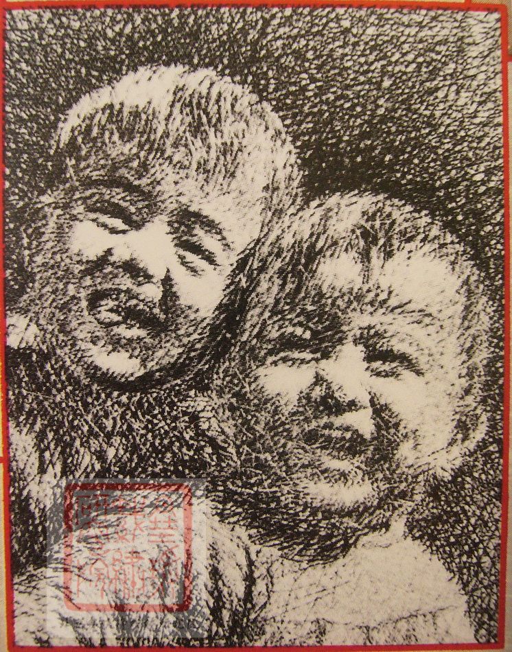 她在校任教期间,借凭自己文、绘、绣等方面的素养,一边教学,一边对刺绣进行变革创新,由于她的能画擅绣,又有文学功底,她用传统刺绣针法,结合素描笔触,油画明暗对比,色彩光影的特点,终于创出了新的绣法,即以看似长知交叉杂乱无章的线条,通过层层加色来完成绣品,一改传统的排比其线、密接其针的方法,首次作品《老头像》(图2-2-2-32)、《儿童》(图2-2-2-33)尝试成功,风格新颖,使所有人眼前一亮。