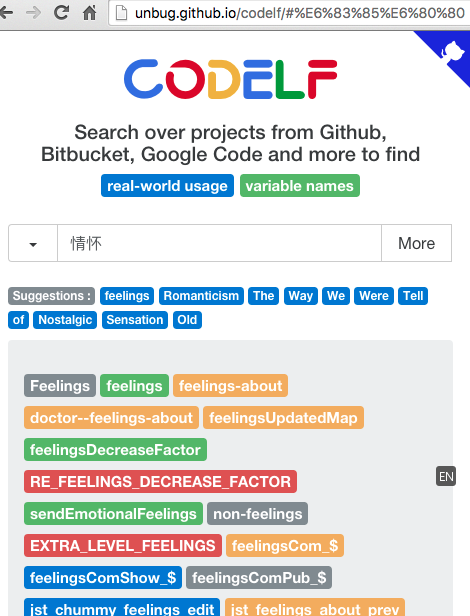 “计算机科学里两件最难的事:缓存失效和命名。” Codelf通过搜索在线开源平台Github, Bitbucket, Google Code, Codeplex, Sourceforge, Fedora Project的项目源码,帮开发者从中找出已有的匹配关键字的变量名,从而帮助为变量名苦恼的开发者命名。这个搜索服务支持直接搜索中文。