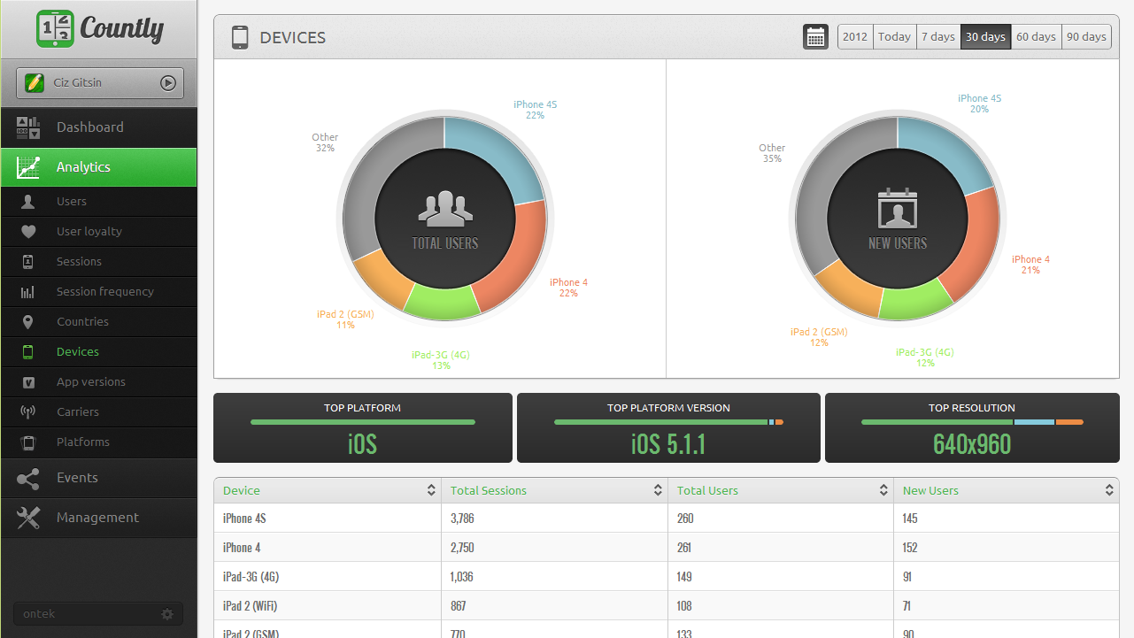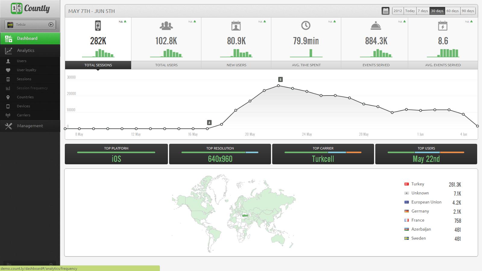 Countly 是一个实时的、开源的移动分析应用,通过收集来自手机的数据,并将这些数据通过可视化效果展示出来以分析移动应用的使用和最终用户的行为。一旦你打开该程序的面板,你会发现数据的监控是那么的简单。