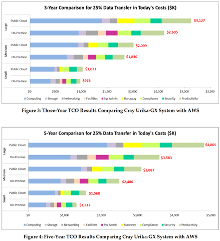 对于广大行业用户关心的总体拥有成本方面,Cray给出的分析结论是Urika大数据一体机比AWS公有云的TCO都要显著低一些,而且随着使用周期的延长,企业内部部署的大数据一体机的TCO优势还会进一步增加(下图)