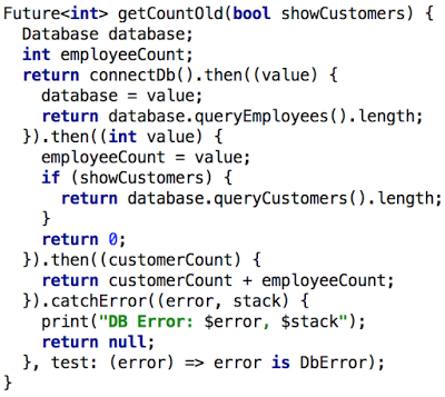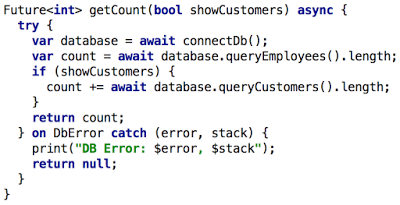 Dart 1.9 引入了 async 方法和 await 表达式,都是基于现有的 Future API。Dart 1.9 可以使用:for/while 循环,if 块和 try/catch 来管理复杂的异步交互。
